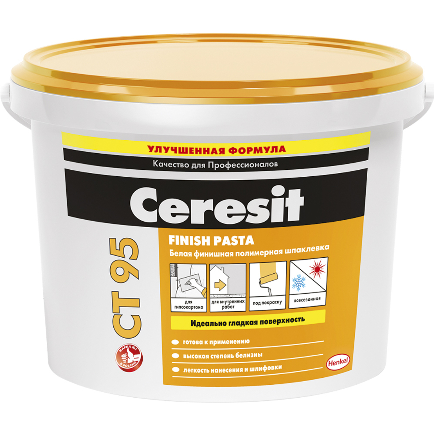 Ceresit CT 95 финишная готовая к применению шпаклевочная смесь, на полимерной основе предназначена для окончательного сглаживания оснований стен, потолков только внутри помещений, для последующего нанесения декоративных материалов (краска, все виды обоев, жидкие обои и т.д.). Применяется на бетонные, оштукатуренные основания, гипсокартонные основания. Отлично подходит для поверхностей, которые обладают низкой марочной прочностью и достаточно хорошо впитывают влагу. За счет добавления полимерных наполнителей (мелкодиспрвионных), СТ 95 образует очень гладкую поверхность у основания. Поверхность получается идеально белоснежной, что в итого позволяет сократить расход лакокрасочных материалов. Единственный минус, нельзя применять на деревянных основаниях.