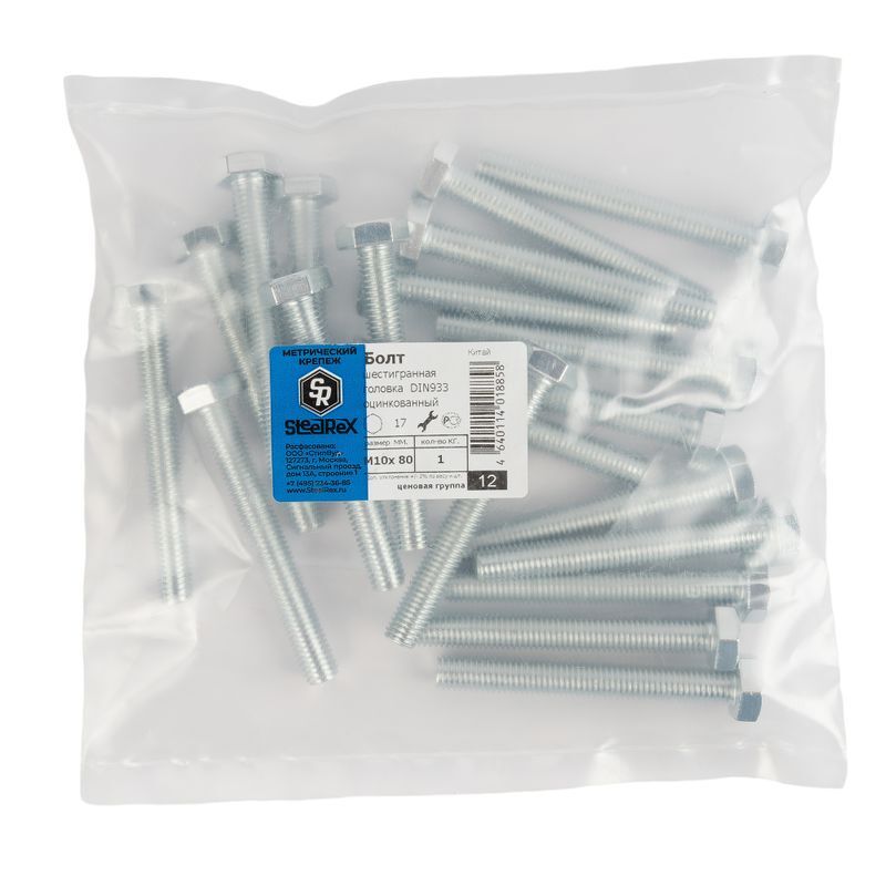 Болт M10x80 мм от бренда Steelrex – универсальная надежность класса прочности 5.8 по стандарту DIN 933. С диаметром стержня 10 мм и шагом резьбы 1.5 мм болт легко сочетается со множеством конструкций благодаря своей форме головки под ключ размером 17 мм. При заказе партии минимальным количеством от одного экземпляра и общем весе упаковки около 200 грамм можно обеспечить стабильность любых соединений.