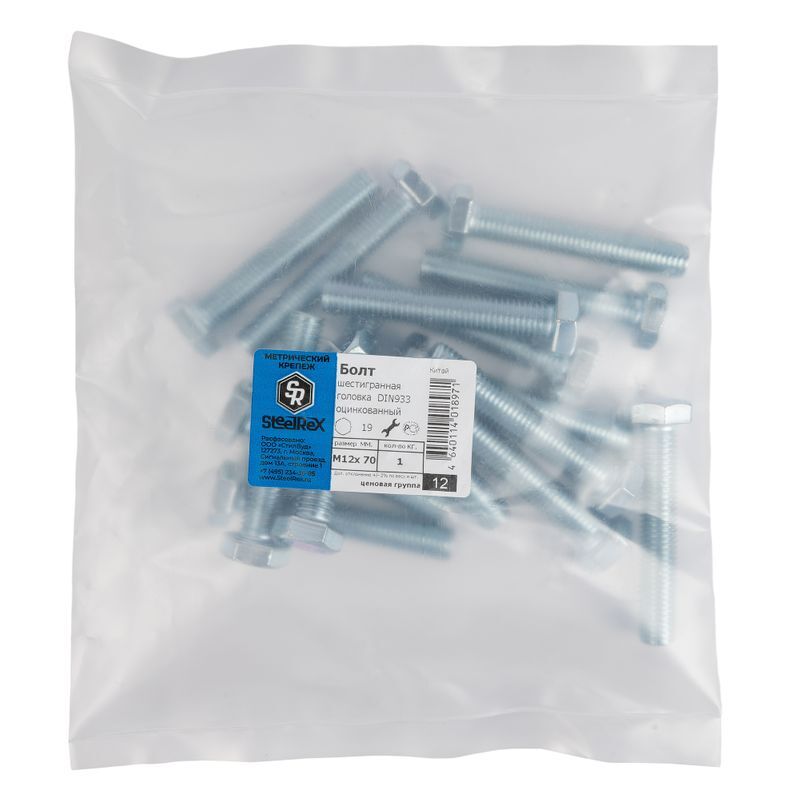 Болт M12×70 мм от Steelrex – надежное крепление по стандарту DIN 933 класса прочности 5.8, обеспечивающее максимальную безопасность соединения благодаря своей универсальности и качеству исполнения. Головка размером 19 мм подходит под любой соответствующий инструмент, а шаг резьбы в 1.75 мм гарантирует идеальную фиксацию деталей. Один килограмм этого высококачественного метиза содержит около 15 штук болтов.