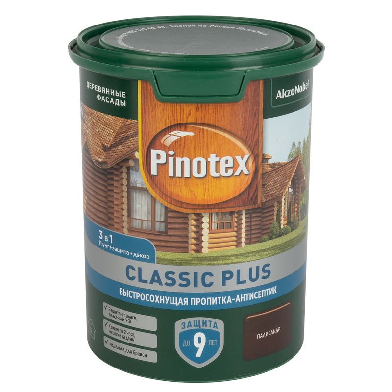 Pinotex Classic Plus – это декоративно-защитное акрилово-алкидное средство по дереву в категории «три в одном»: защита от ультрафиолета, грибка, плесени и насекомых. Питает и украшает древесину цветом палисандра (полуматовый), сохраняя её текстуру. Быстро сохнет, колеруется, отталкивает воду и грязь. Подходит для наружных работ. Наносится кистью, валиком или распылителем из расчёта до 15 м²/л на строганную поверхность. Гарантия качества — 3 года со дня покупки!