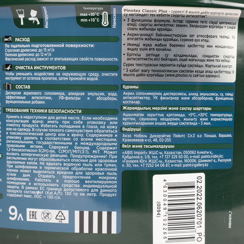 Pinotex Classic Plus – это надежное декоративно-защитное средство «три в одном» от грибка, насекомых и ультрафиолета. Подходит для наружных деревянных поверхностей (расход: до 15 кв.м./л). Быстро сохнет, легко колеруется, образует водоотталкивающее и грязеотталкивающее полуматовое покрытие. Объем 9 литров позволяет эффективно обработать большие площади. Удобен в нанесении кистью, валиком или распылителем.