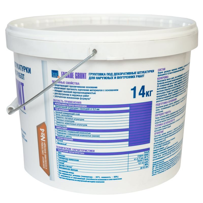Грунтовка Bergauf Facad Grunt — это высококачественный бетоноконтакт, предназначенный для ручного нанесения на стены перед использованием декоративных штукатурок как снаружи, так и внутри помещений. Подходит для работы по гипсокартону, газобетону и уже имеющимся штукатуркам. Обеспечивает отличную адгезию основания и финишного покрытия благодаря своей уникальной формуле. Характеризуется быстрым временем высыханием (всего 5-6 часов), что позволяет значительно ускорить ремонтные работы. Обладает высокой экономичностью расхода (от 200 до 500 гр/м²). Фасовка объемом 14 литров делает его удобным для использования даже на больших площадях.