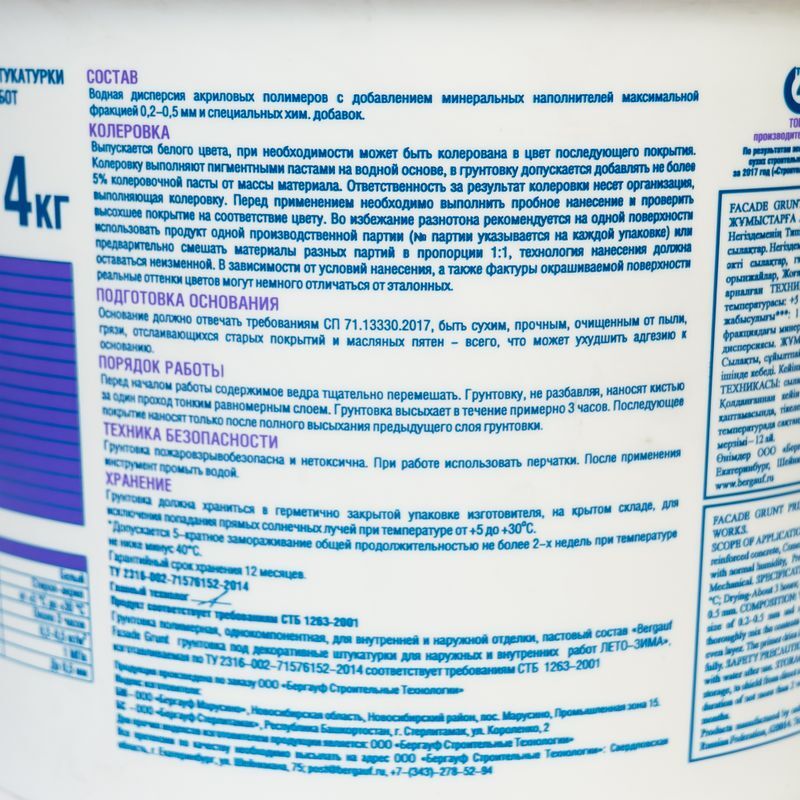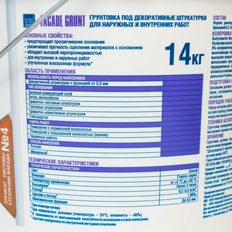 Характеристики товара «Грунтовка Bergauf Facad Grunt под декоративные штукатурки 14 кг»