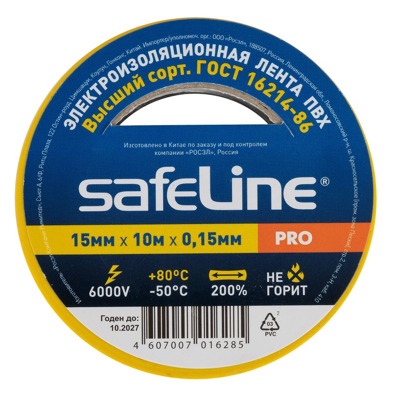 Характеристики товара «Изолента желтая 15 мм 10 м Safeline»
