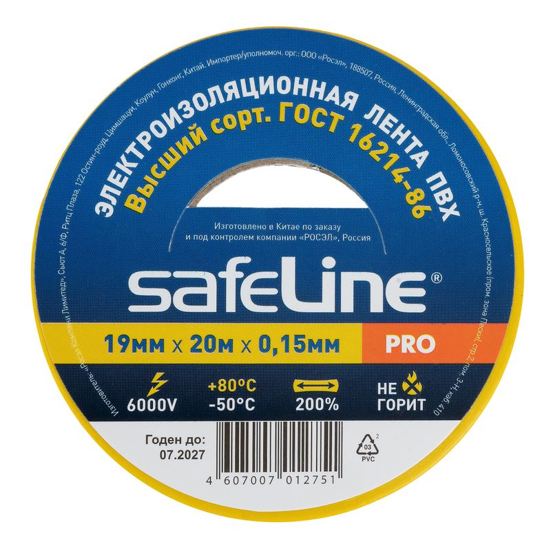 Характеристики товара «Изолента желтая 19 мм 20 м Safeline»