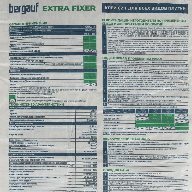 Характеристики товара «Клей для плитки Бергауф Extra Fixer C2T 25 кг»