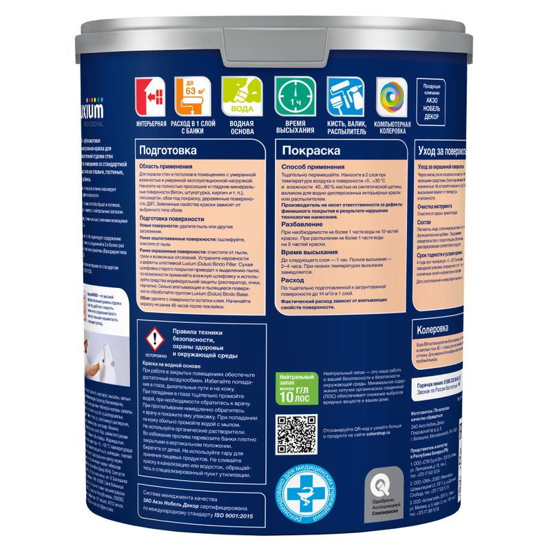 Латексная краска Luxium Bindo 3 глубокой матовости идеально подходит для интерьерных работ в квартире, доме, спальне, детской, гостиной, а также медицинских учреждениях. Подходит для любых оснований (бетон, штукатурка, обои, кирпич, гипсокартон). Быстро сохнет (за час), легко наносится кистью, валиком или распылителем, обладает повышенной влагостойкостью и моющимся эффектом. Держит цвет до 12 лет, экономична – расход всего до 14 м²/л. Универсальна в применении при температуре от +5°C до +30°C.