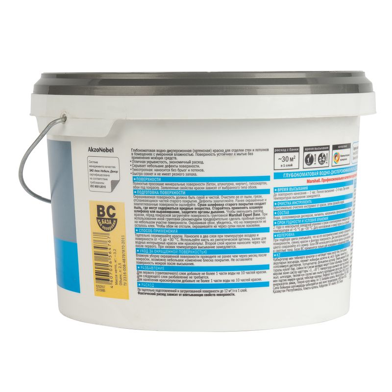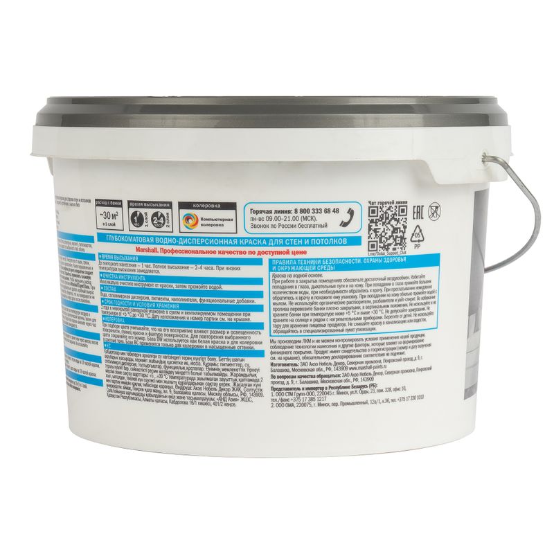 Характеристики товара «Краска интерьерная моющаяся Marshall Export 2 глубокоматовая база С 2,5 л»