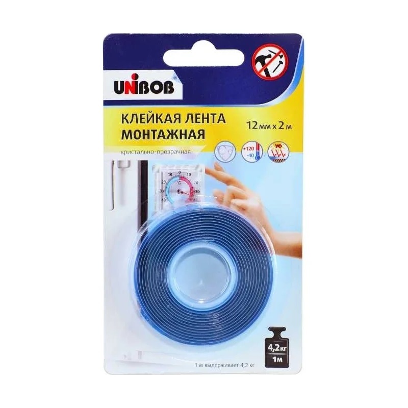 - Лента двухсторонняя 12 мм 2 м монтажная прозрачная UNIBOB