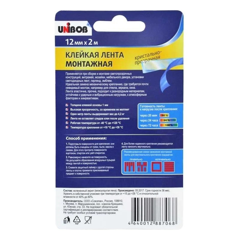 Характеристики товара «Лента двухсторонняя 12 мм 2 м монтажная прозрачная UNIBOB»