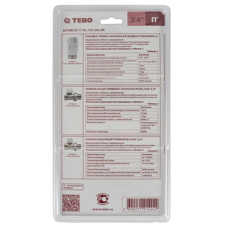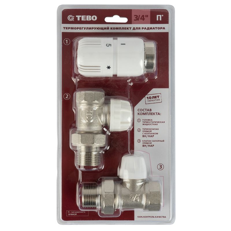 Профессиональное решение от бренда Tebo! Набор для подключения радиатора 3/4" прямой обеспечивает надежное соединение при рабочем давлении до 10 бар и температуре до +110°C. Изготовлен из латуни, комплектуется маховичным регулятором, головкой термостатической и клапанами (термоклапан и клапан запорный). Гарантия 60 месяцев. Удобен в монтаже и эксплуатации – ваш комфорт гарантирован!