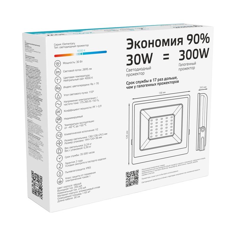 Характеристики товара «Прожектор светодиодный уличный 30Вт 4000К IP65 нейтральный белый свет Gauss»