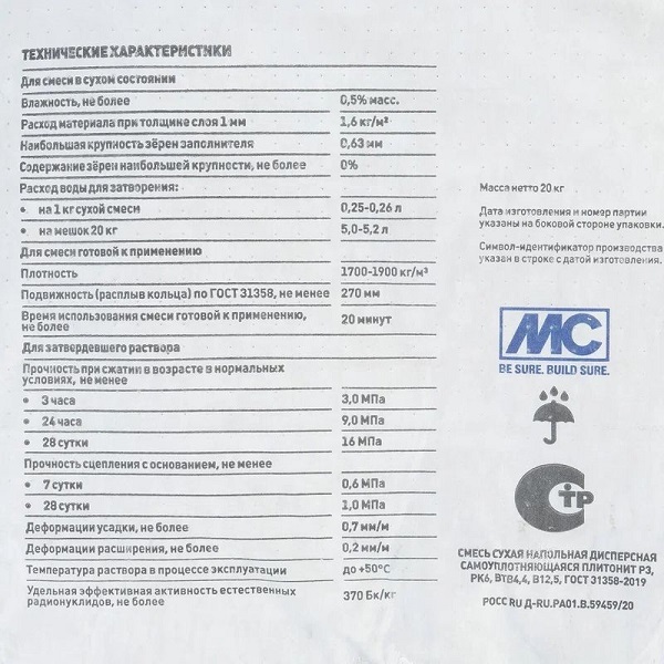 Ровнитель для пола Плитонит Р3 – это профессиональное решение для идеального финишного выравнивания полов внутри помещений. Подходит как для жилых (квартир, кухонь), так и коммерческих объектов (офисов). Благодаря цементной основе и самовыравнивающимся свойствам, этот продукт обеспечивает простоту использования и отличный результат даже без специальных навыков. Преимуществами ровнителя являются быстрота твердения и возможность монтажа теплого пола. Через два часа после укладки можно ходить, а уже через неделю укладывать напольные покрытия. Кроме того, он обладает высокой прочностью на сжатие (через 28 суток) – 15 МПа и адгезией – 1 МПа. Данный товар имеет вес 20 кг и может храниться до 12 месяцев.