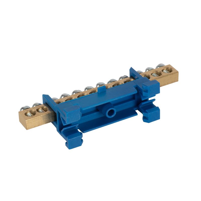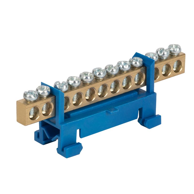 - Шина нулевая 12 отверстий, латунь, изолятор "стойка" на DIN-рейку, синий, 6х9 мм