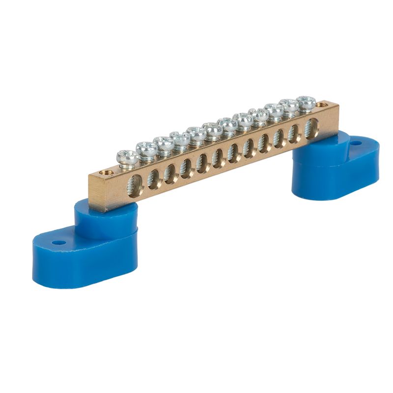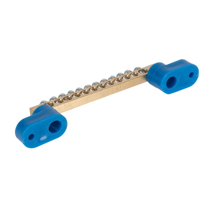 - Шина нулевая 12 отверстий с 2-я угловыми изоляторами, крепеж по центру 6х9 мм