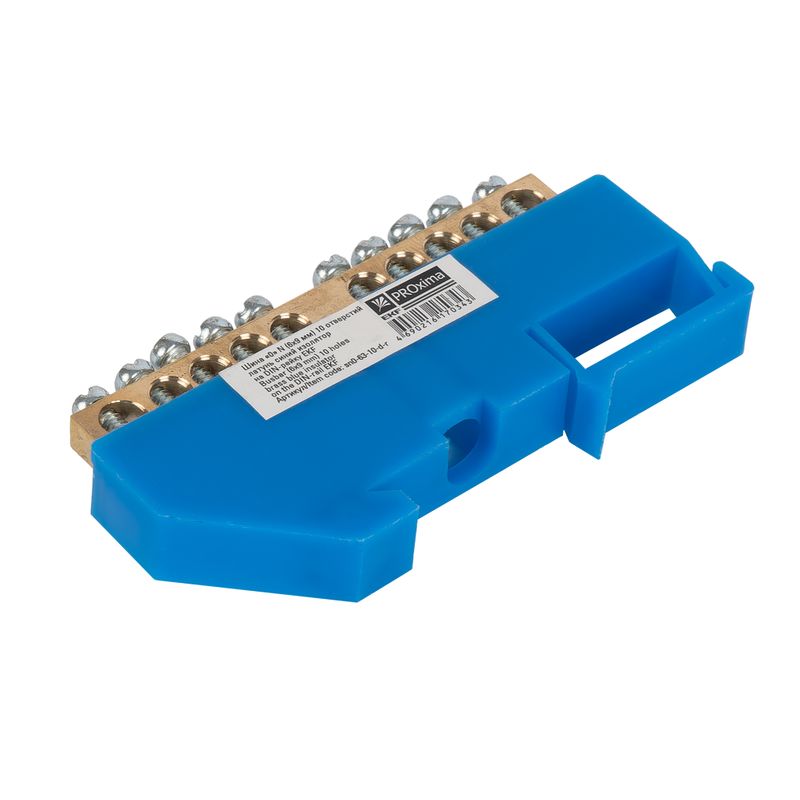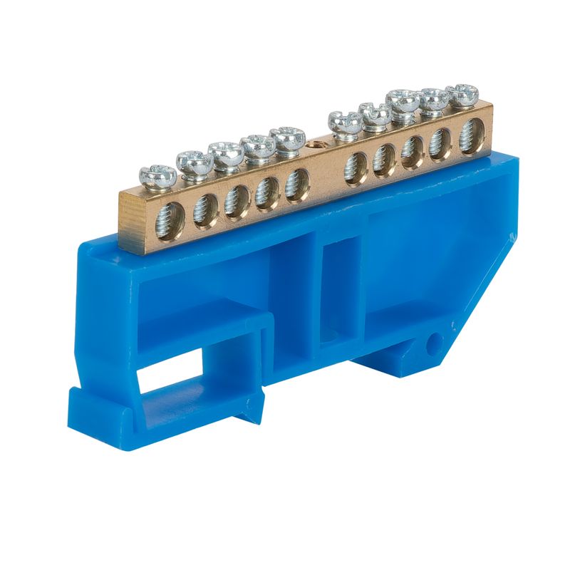 - Шина нулевая N 10 отверстий изолятор на DIN-рейку синий 6х9 мм