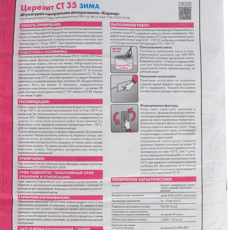 Декоративная штукатурка Ceresit CT 35 «Короед» – идеальное решение для интерьеров и фасадов зданий. Благодаря фракционному составу 2,5 мм создает оригинальный рисунок, имитирующий ходы жука-короеда. Подходит для любых оснований (бетон, гипсокартон), применяется при температуре от -10°С до +30°C. Преимущества: — Высокая морозостойкость F100; — Долговечность благодаря ударостойкости и атмосфероустойчивости; — Удобство использования зимой; — Экономичный расход — всего до 2кг/м². Срок годности 12 месяцев.