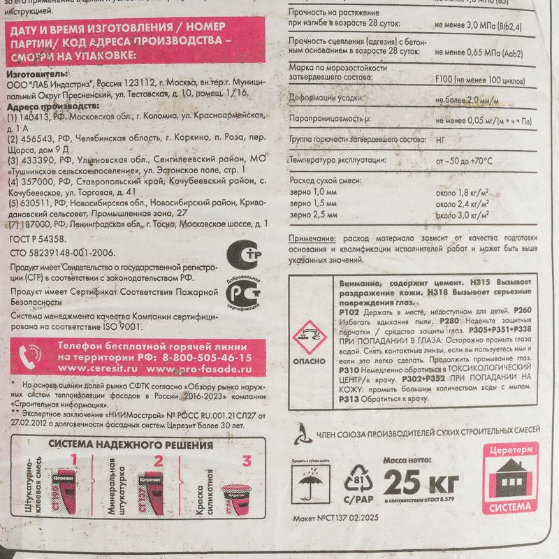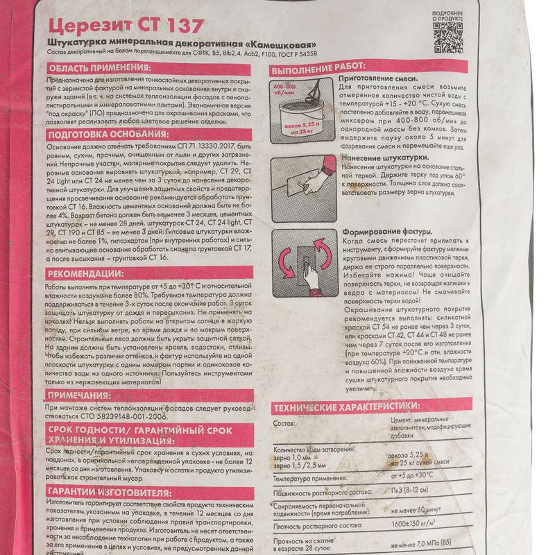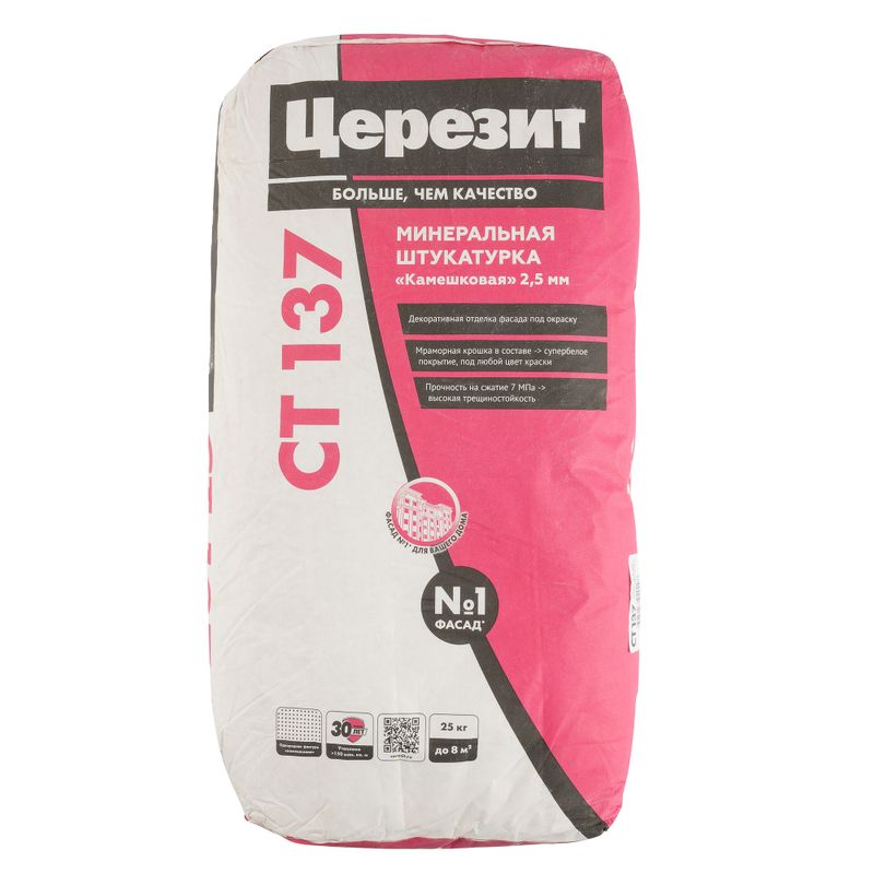 Характеристики товара «Штукатурка декоративная Церезит СТ 137 камешковая зерно 2,5 мм 25 кг»