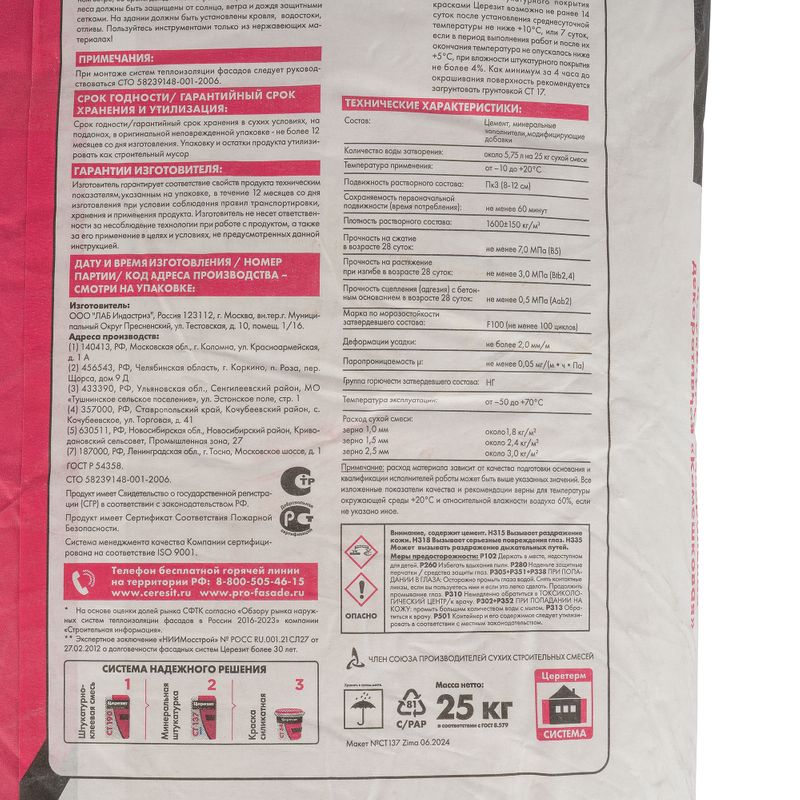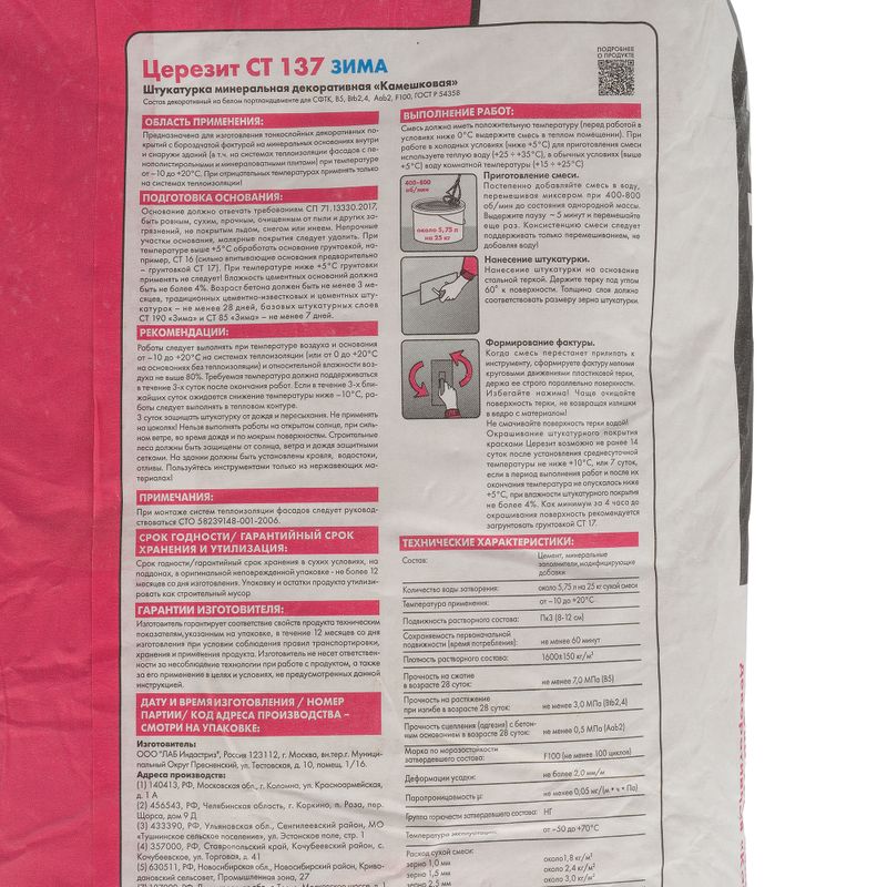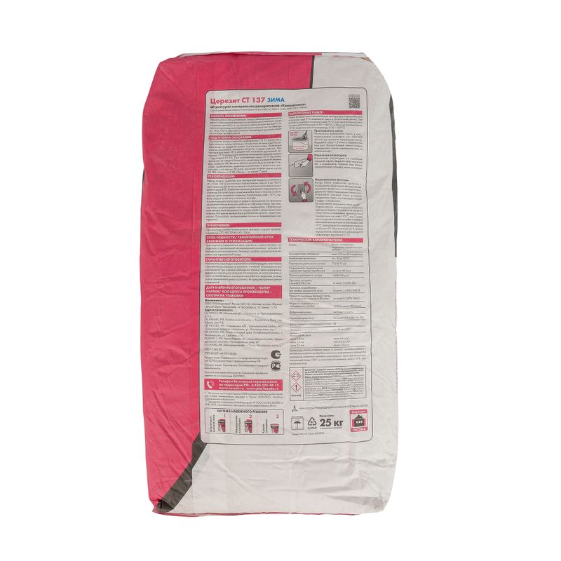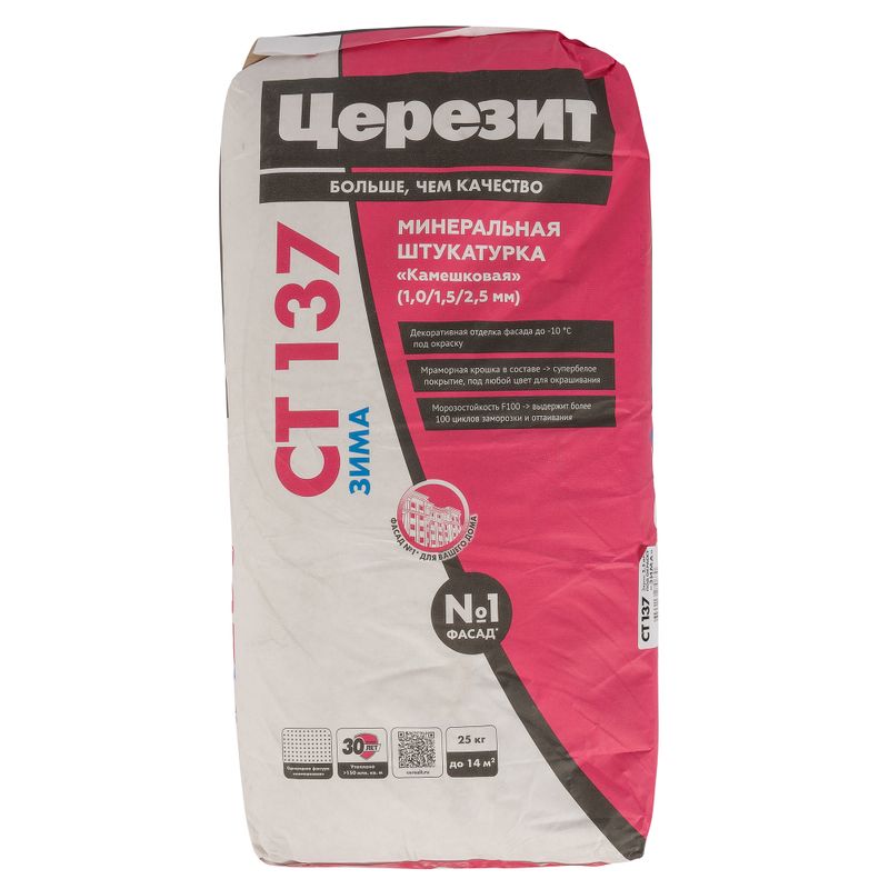 Характеристики товара «Штукатурка декоративная Церезит СТ 137 камешковая зерно 2,5 мм зима 25 кг»