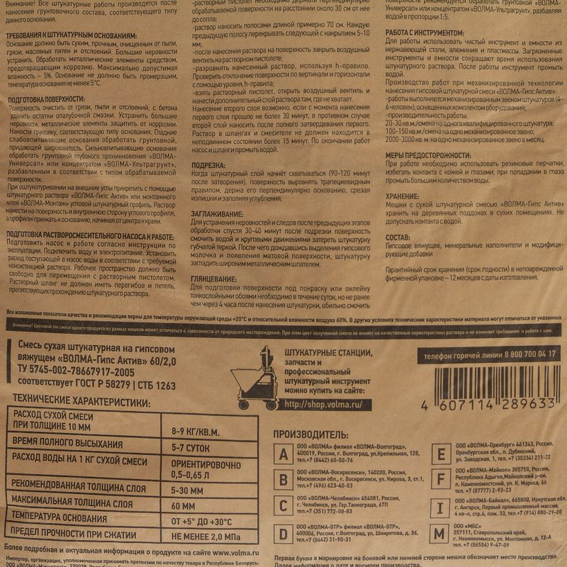 Характеристики товара «Штукатурка гипсовая Волма Гипс-Актив 30 кг»