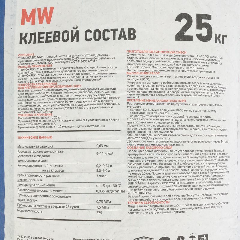- Штукатурно-клеевая смесь для минеральной ваты Termokreps MW 25 кг