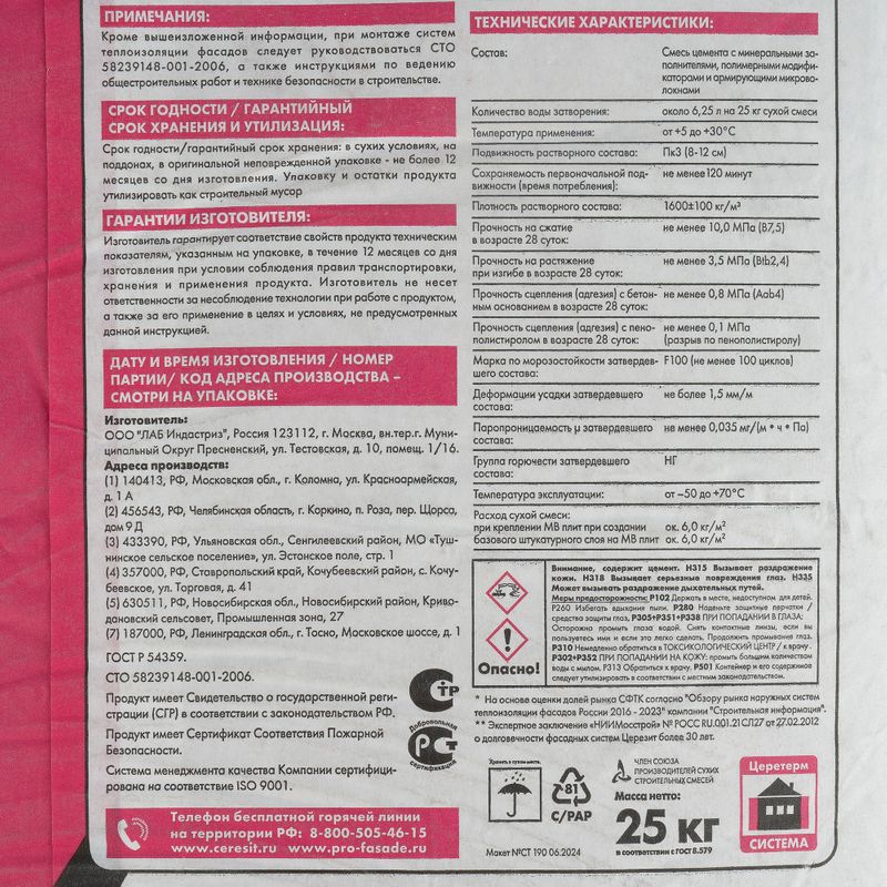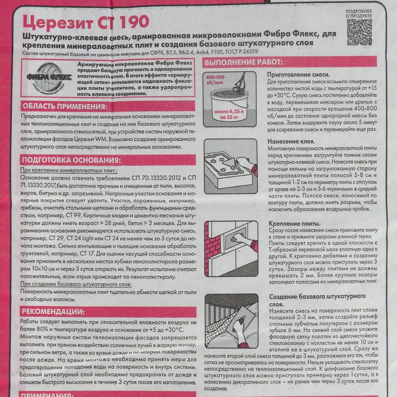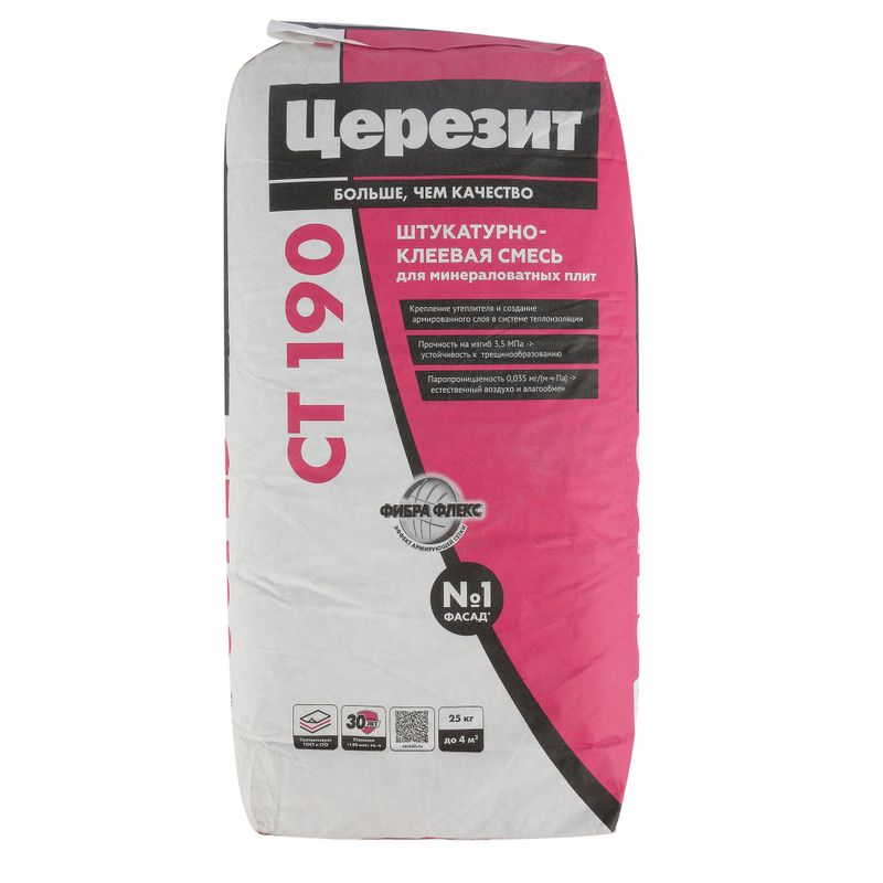 Клей Ceresit CT 190 предназначен как для минераловатных плит, так и для пенополистирольных утеплителей. Он обладает высокой паропроницаемостью, что позволяет стенам "дышать". Также он устойчив к воздействию влажности, атмосферным осадкам и морозу (морозостойкость F 100), а также к температуре окружающей среды от -50 до +70 °C. Этот продукт идеально подходит для использования во всех климатических зонах России.ни.