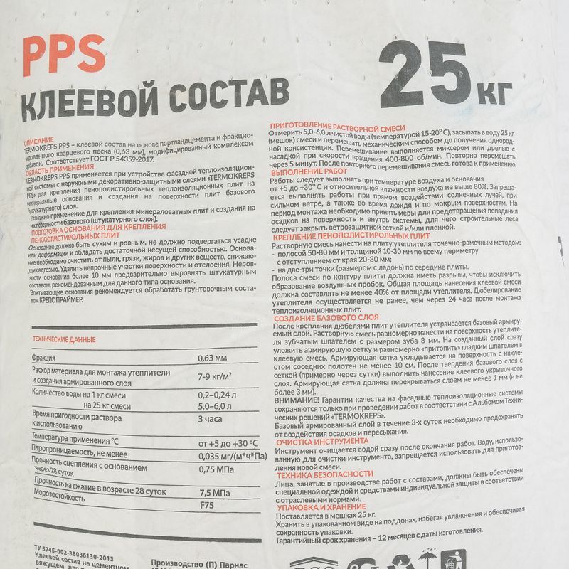 Характеристики товара «Штукатурно-клеевая смесь для пенополистирола Termokreps PPS 25 кг»